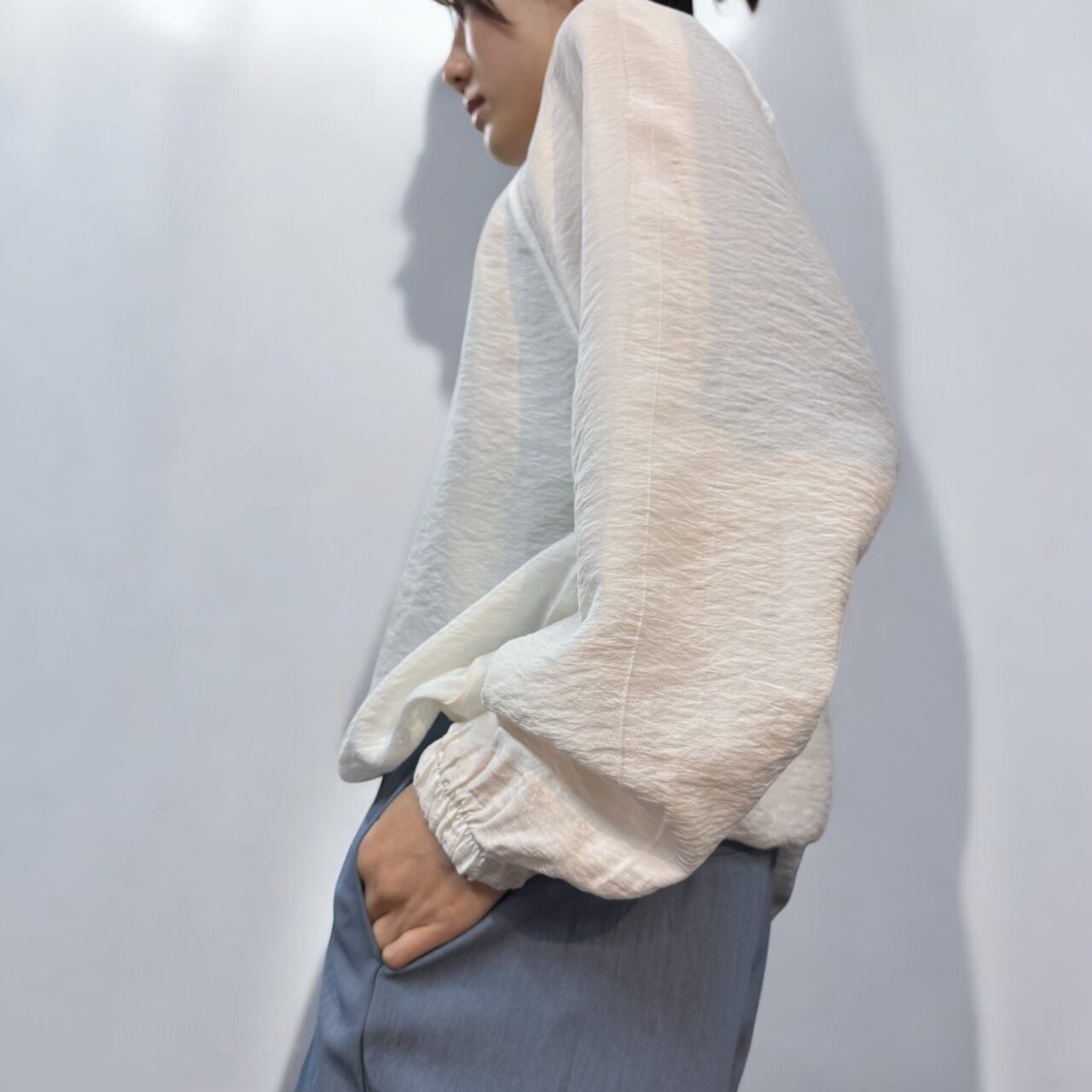 シボ感のあるワッシャー生地を使用したシアーブラウスです!軽やかなシアー素材が、涼しげでありながらも上品な印象を与えます。リブデザインのネックが首元をすっきり見せ、裾に施されたゴム仕様がふんわりとしたブラウジングシルエットを作り出します。これ一着で、普段使いから特別なシーンまで幅広く活躍するアイテムです。