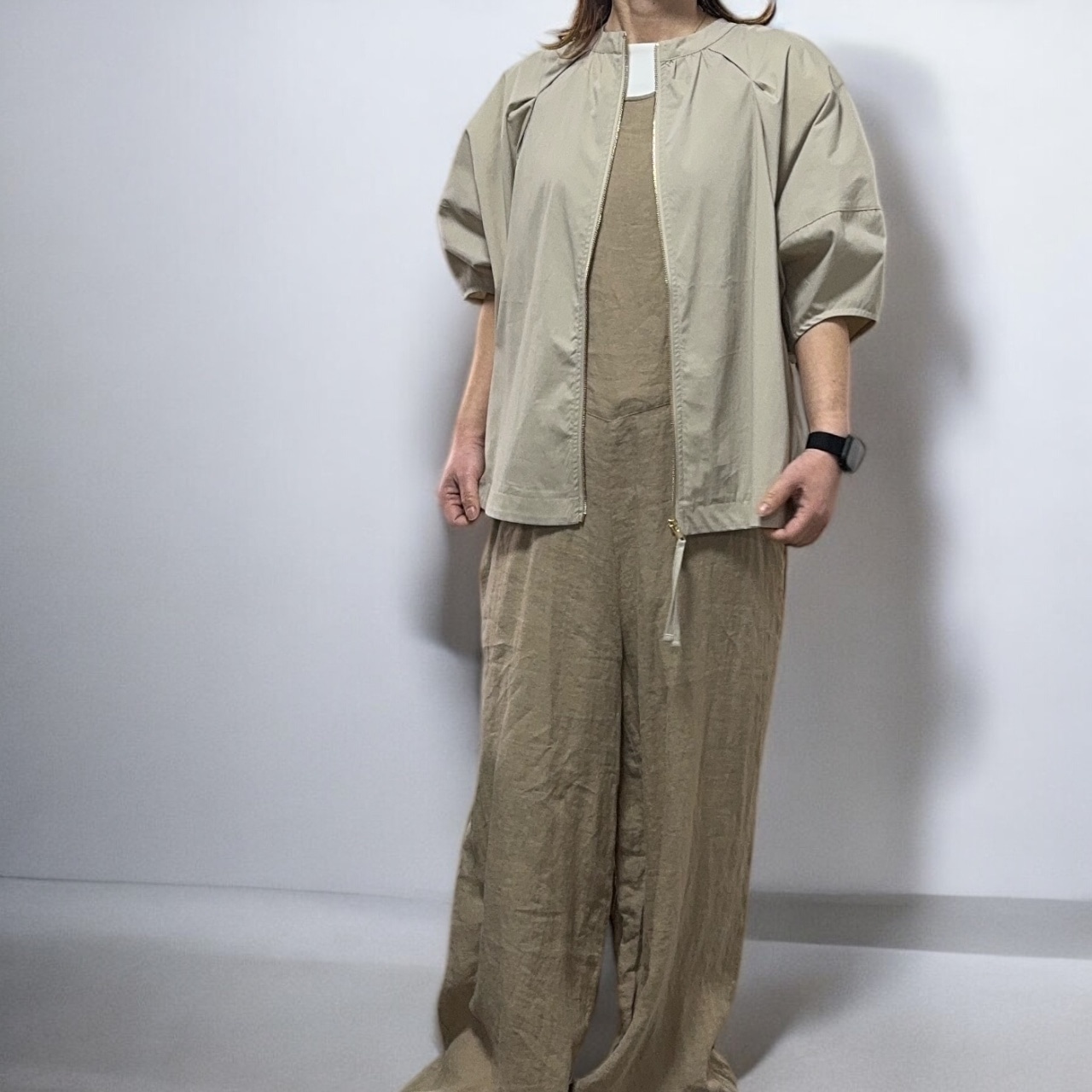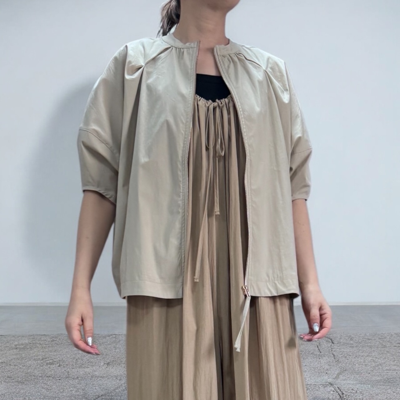 軽い羽織としても使えるジップ開き仕様で、スタイルの幅が広がる一枚。