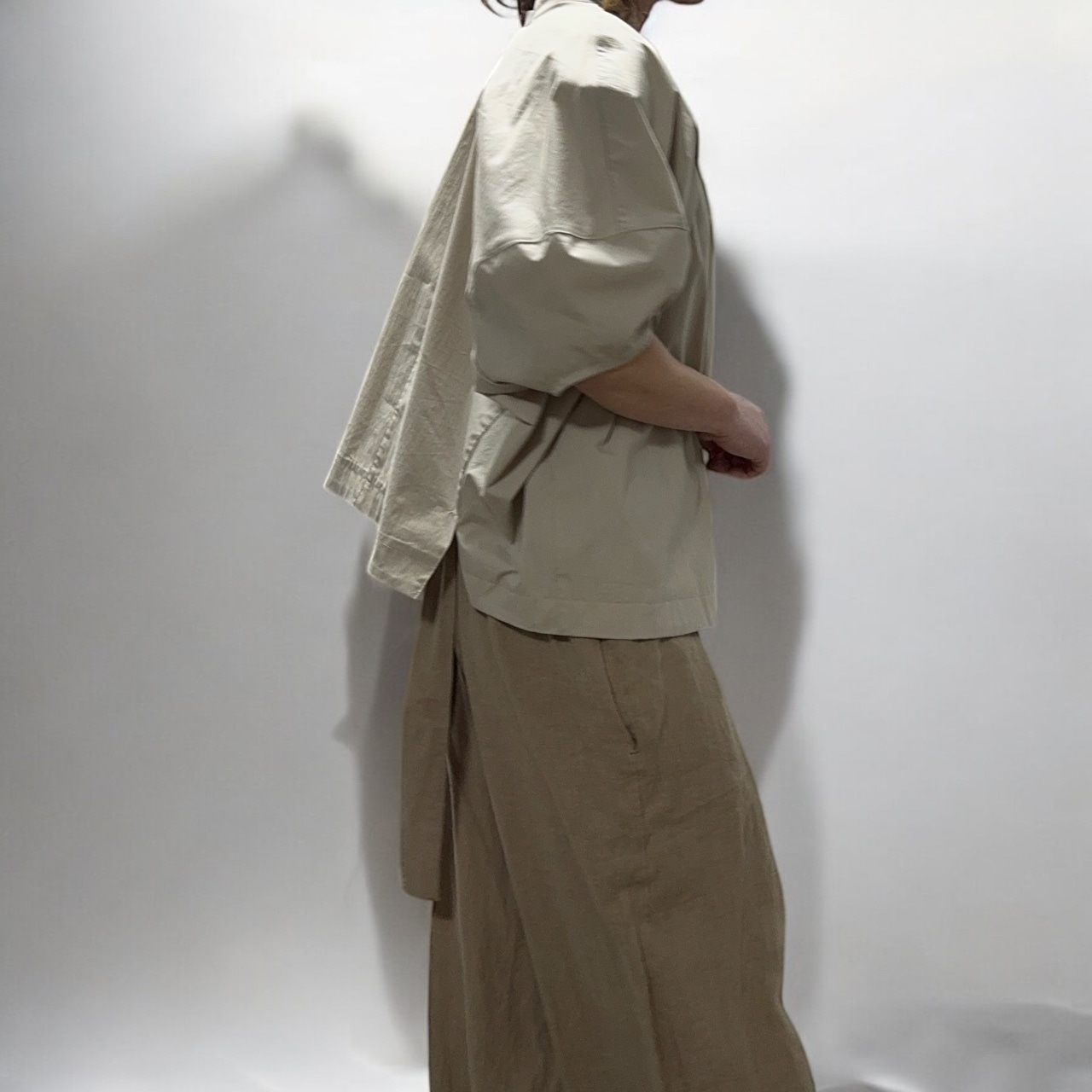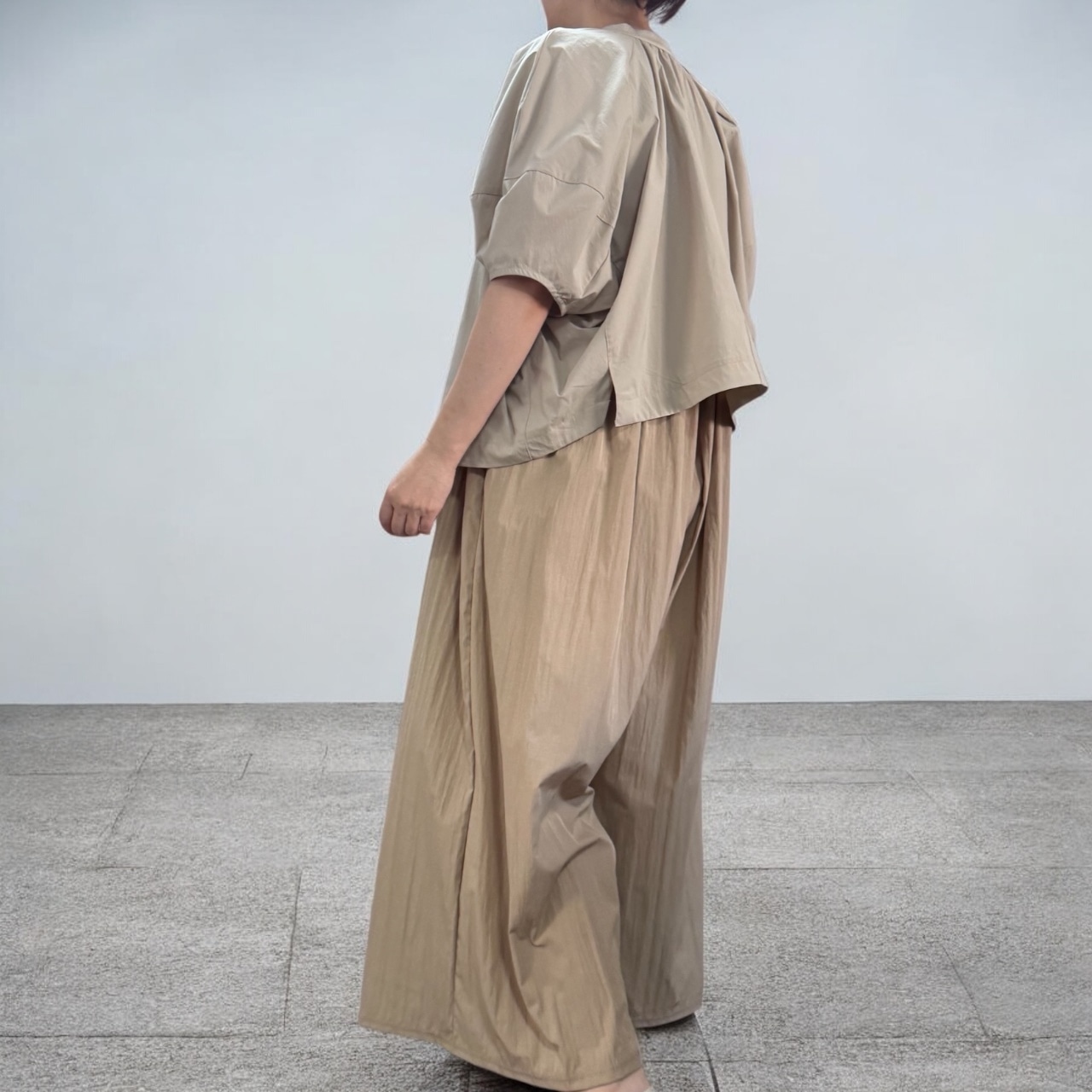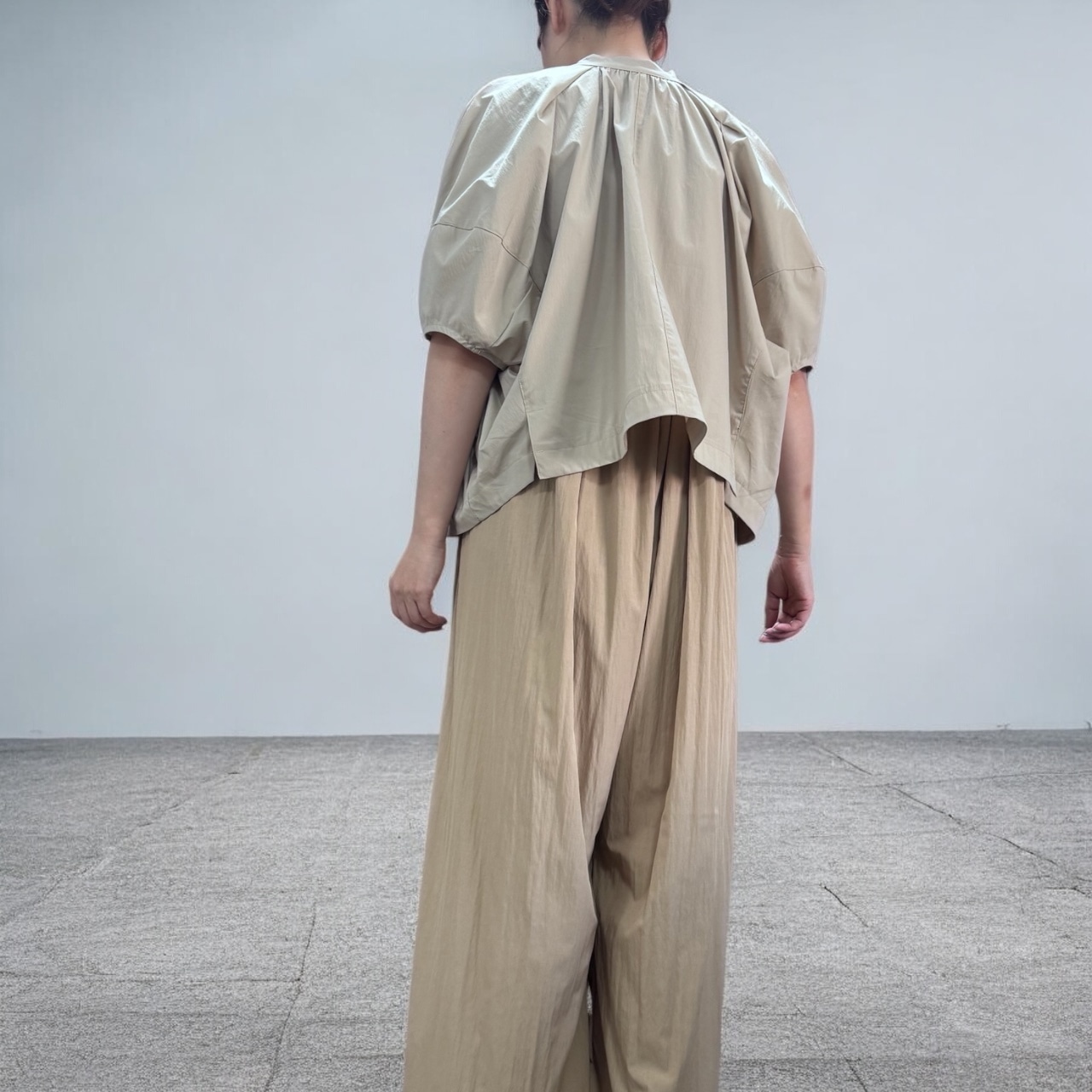 立体感のあるシルエットに加え、前後で表情の変わるタックデザインがこなれた印象を引き立てます。