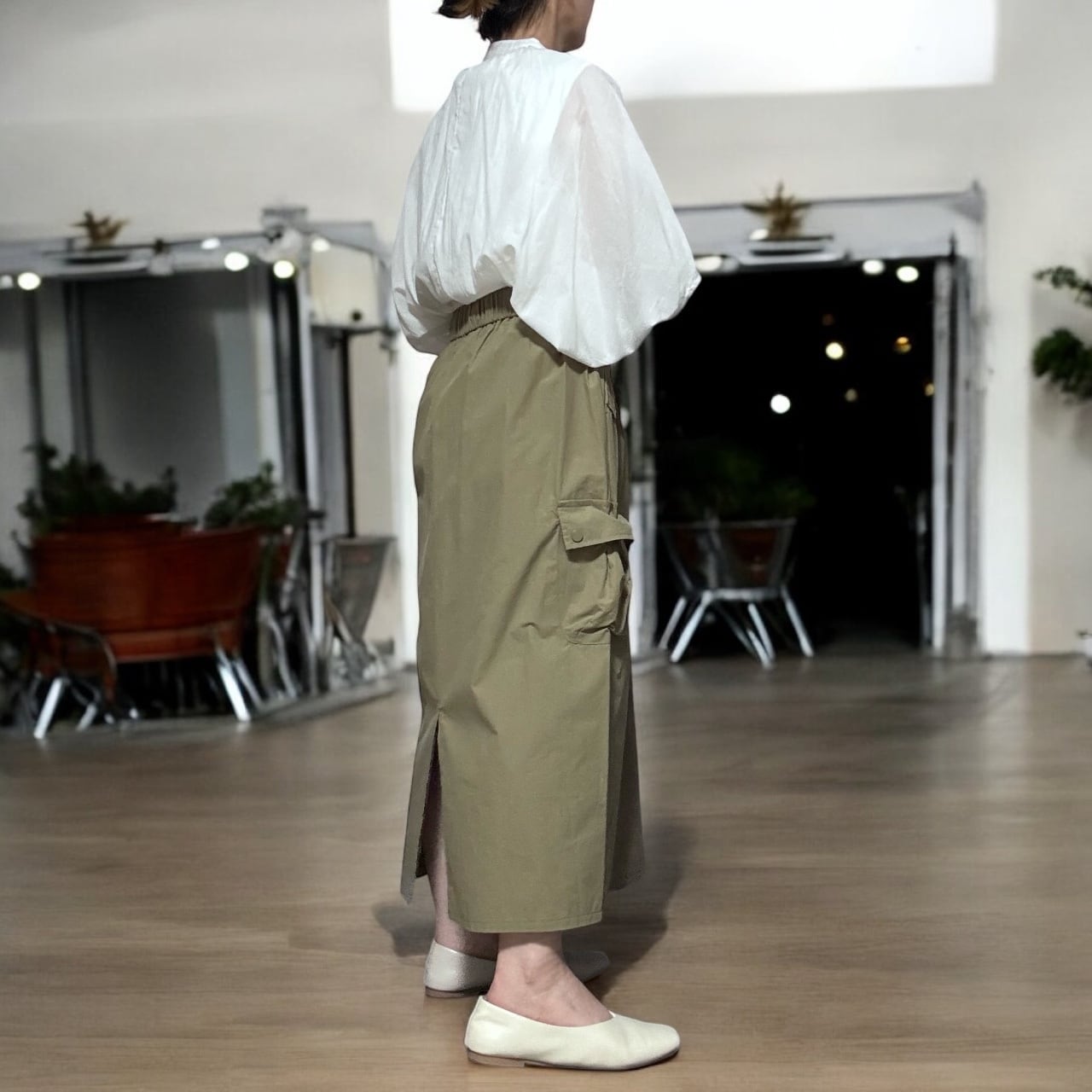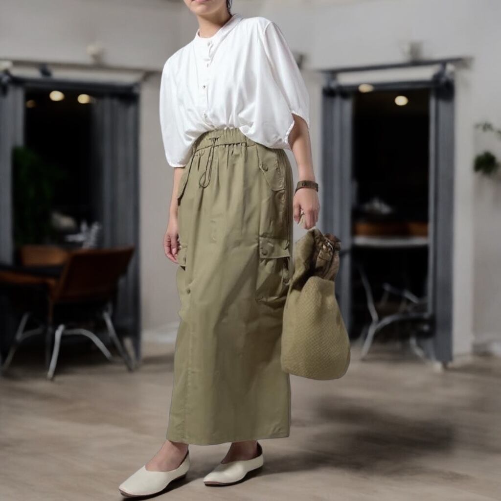 トレンド感を押さえつつ、きれいめなIラインで仕上げたカーゴスカート。