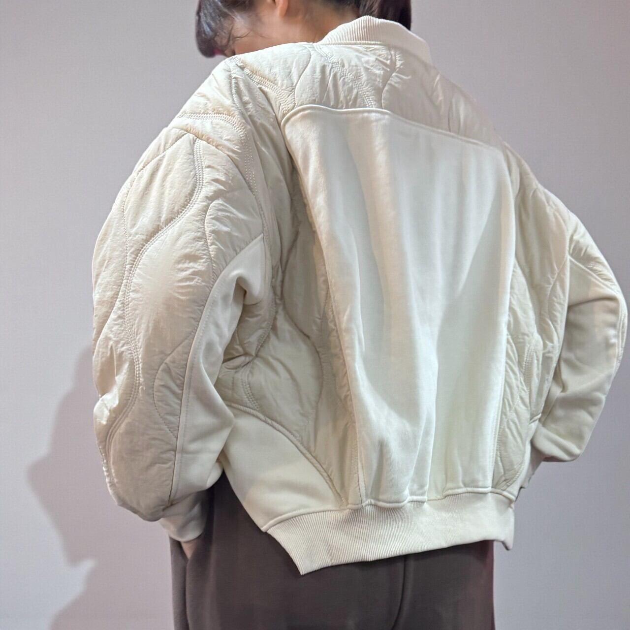 身頃はベーシックなスウェット素材、袖からサイドにかけてはキルティングを切り替えることで、