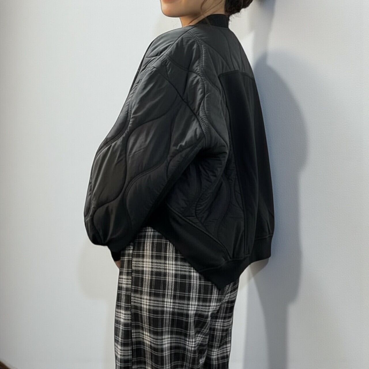 スウェットの気軽さに、中綿キルティングの立体感を掛け合わせたデザイントレーナー。