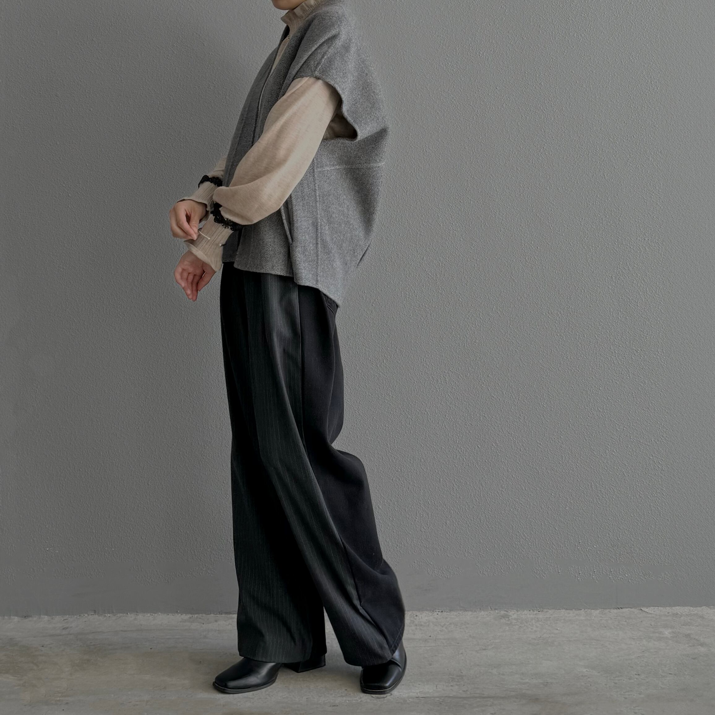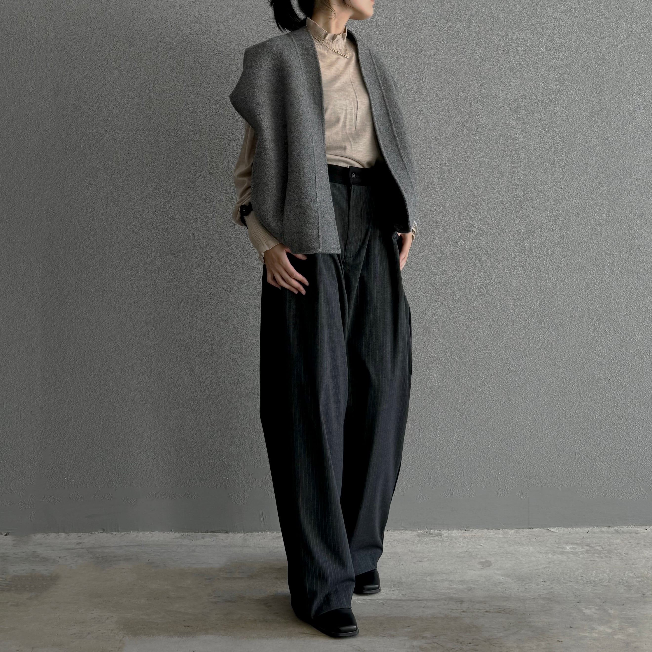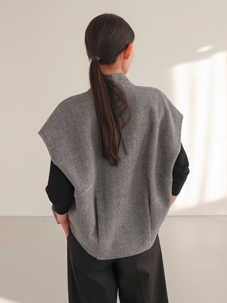 シンプルながら、タックや縫い合わせでデザインされた立体的なシルエットが魅力のオープンベスト。