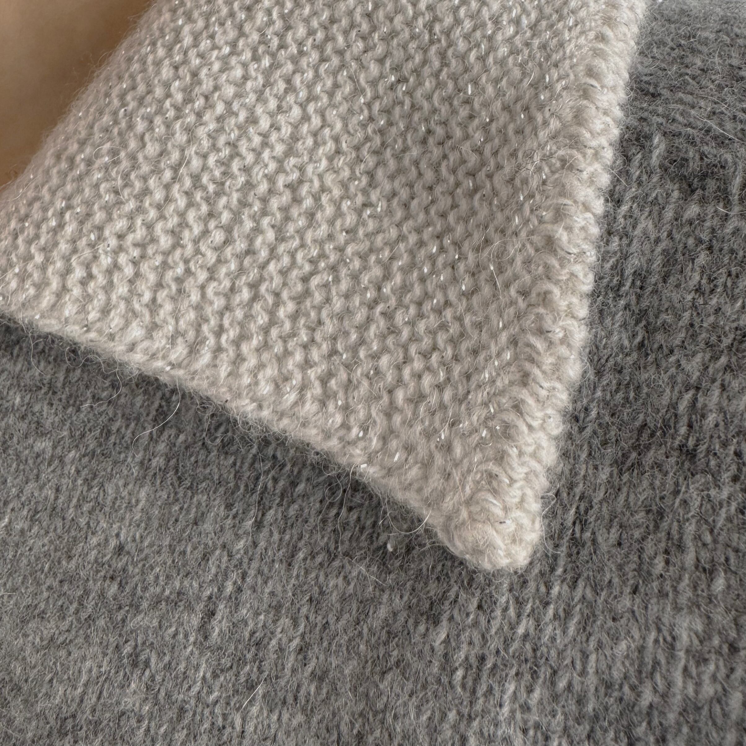 襟にはラメ糸も編み込まれ、動きに合わせて顔周りを華やかにしてくれます。