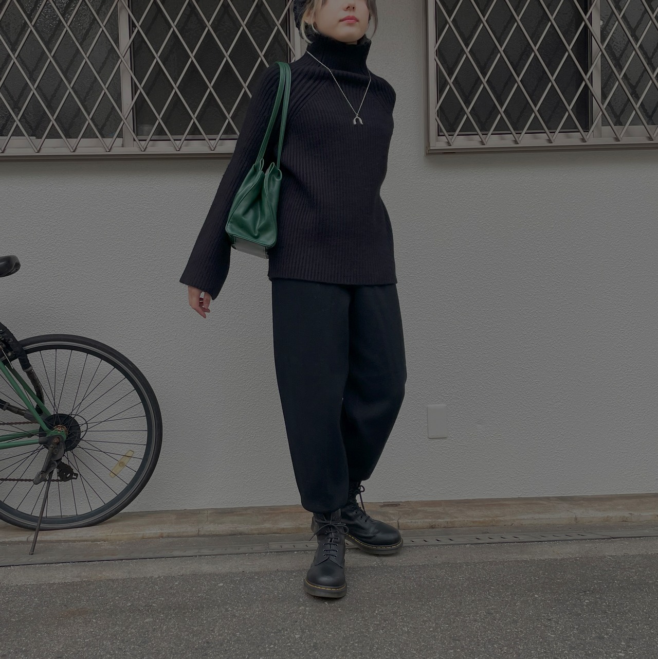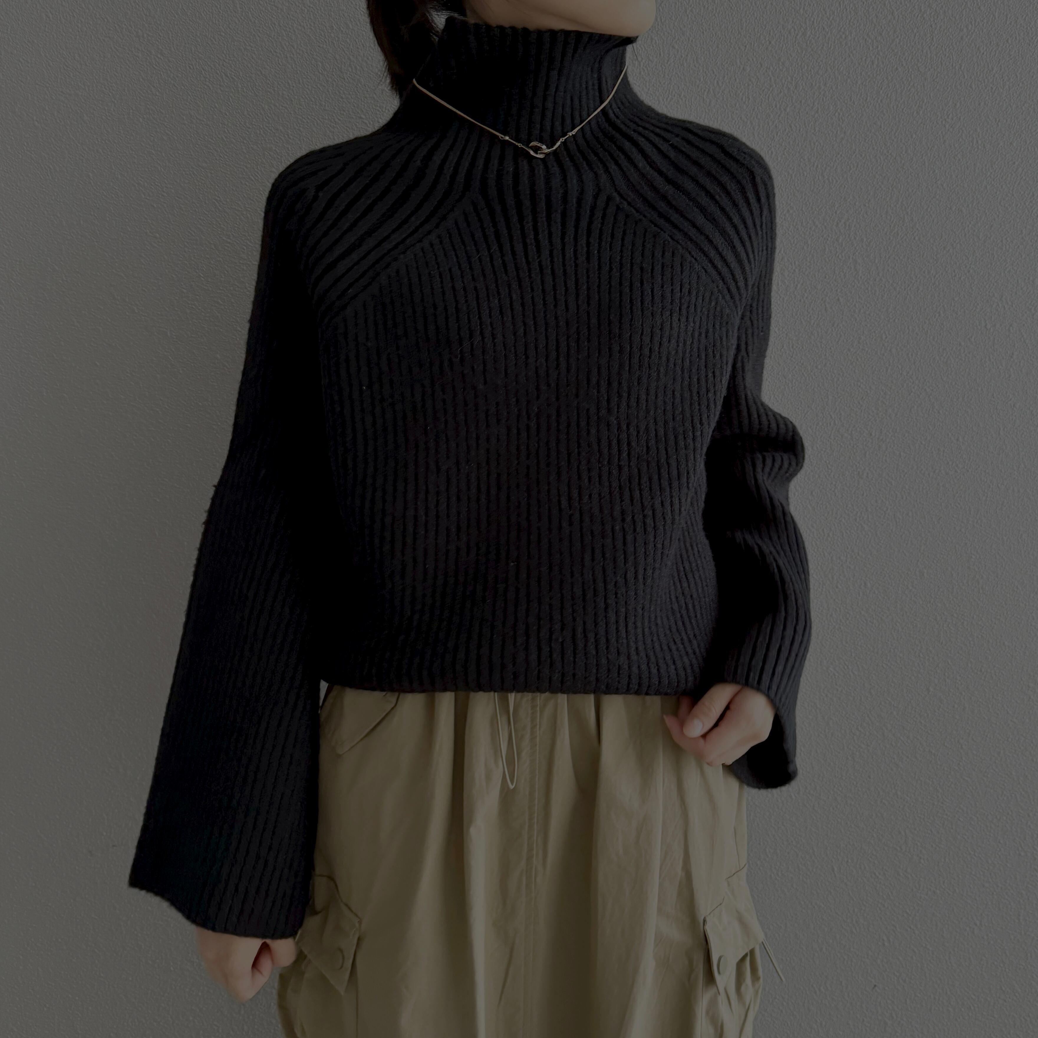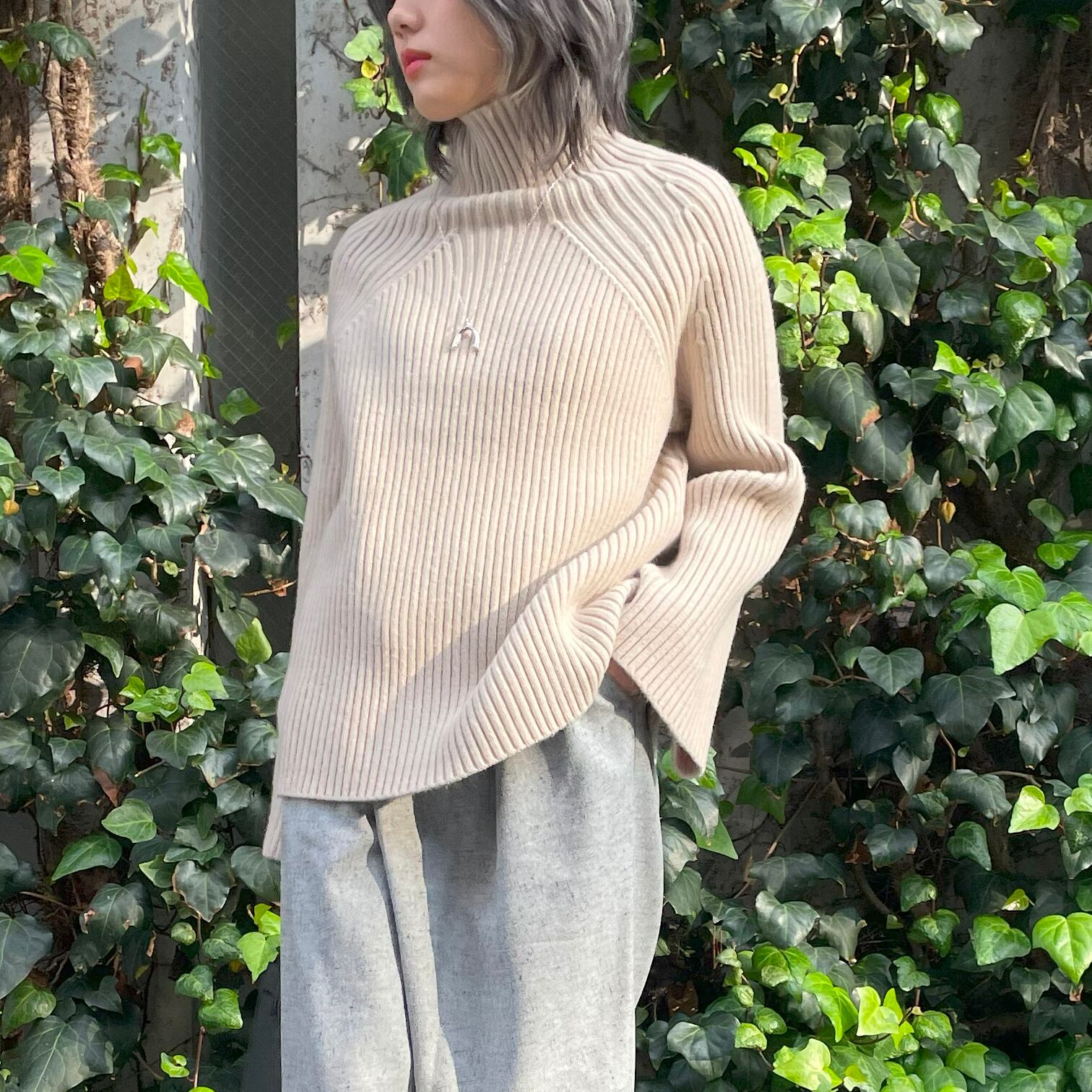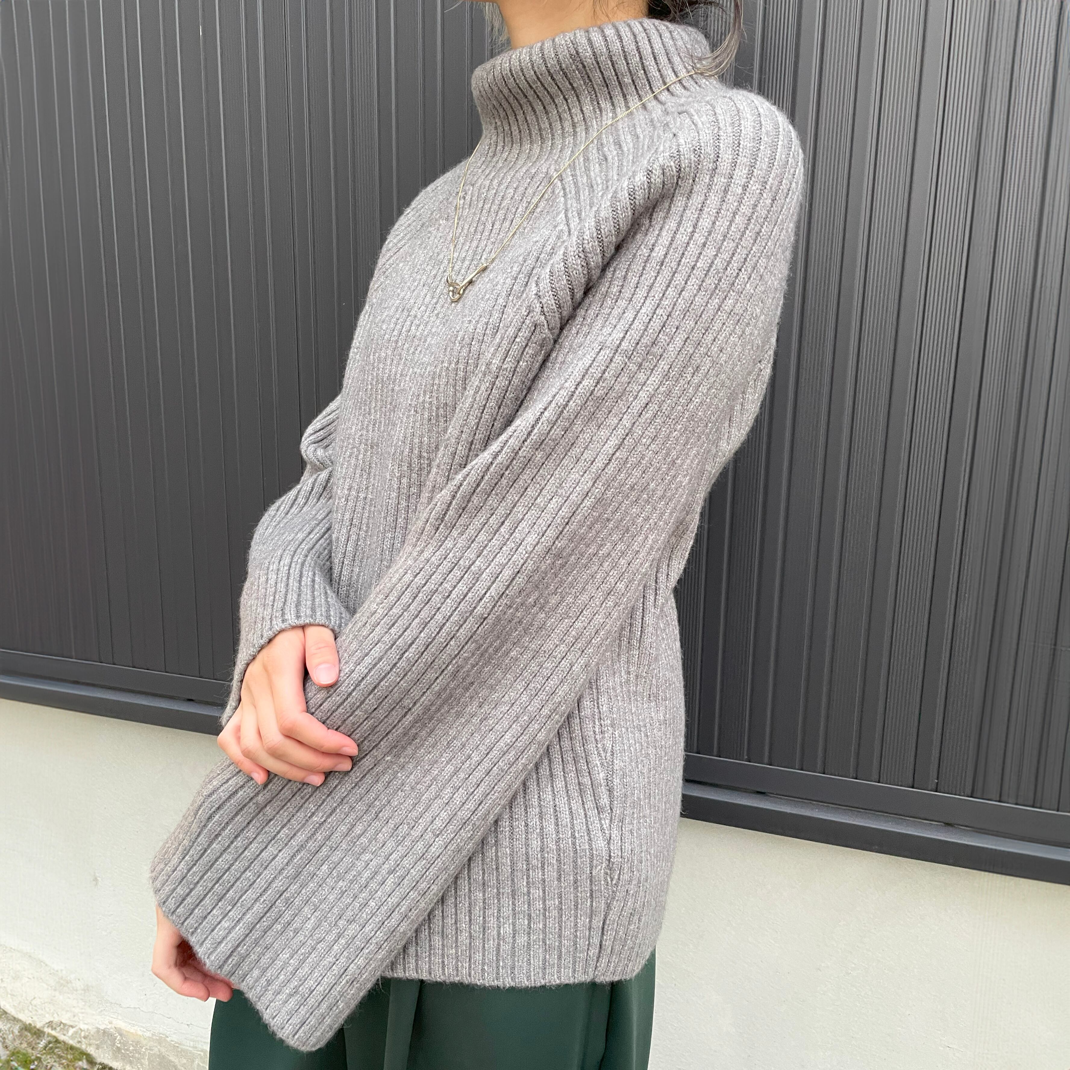 トレンドの高い首元とリブ編みのデザインが特徴です。