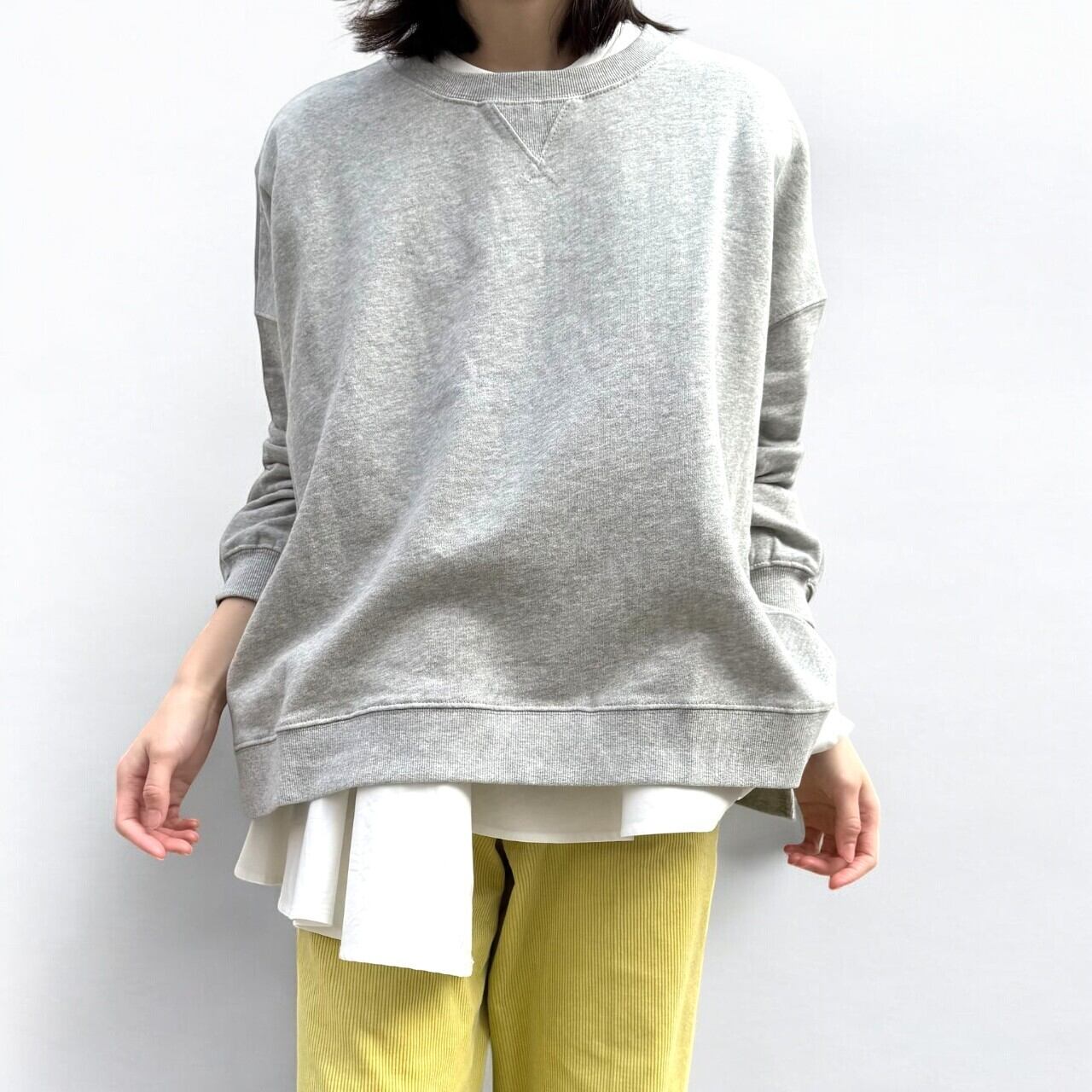 リラックス感とおしゃれさを兼ね備えたサイドスリット裏毛トレーナー。薄手の裏毛素材を使用しており、暖かさを保ちながらも軽やかな着心地が魅力です。