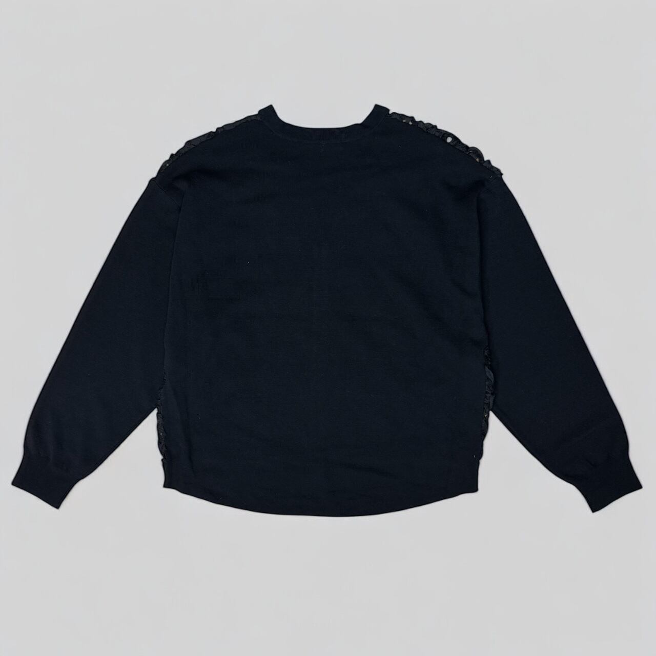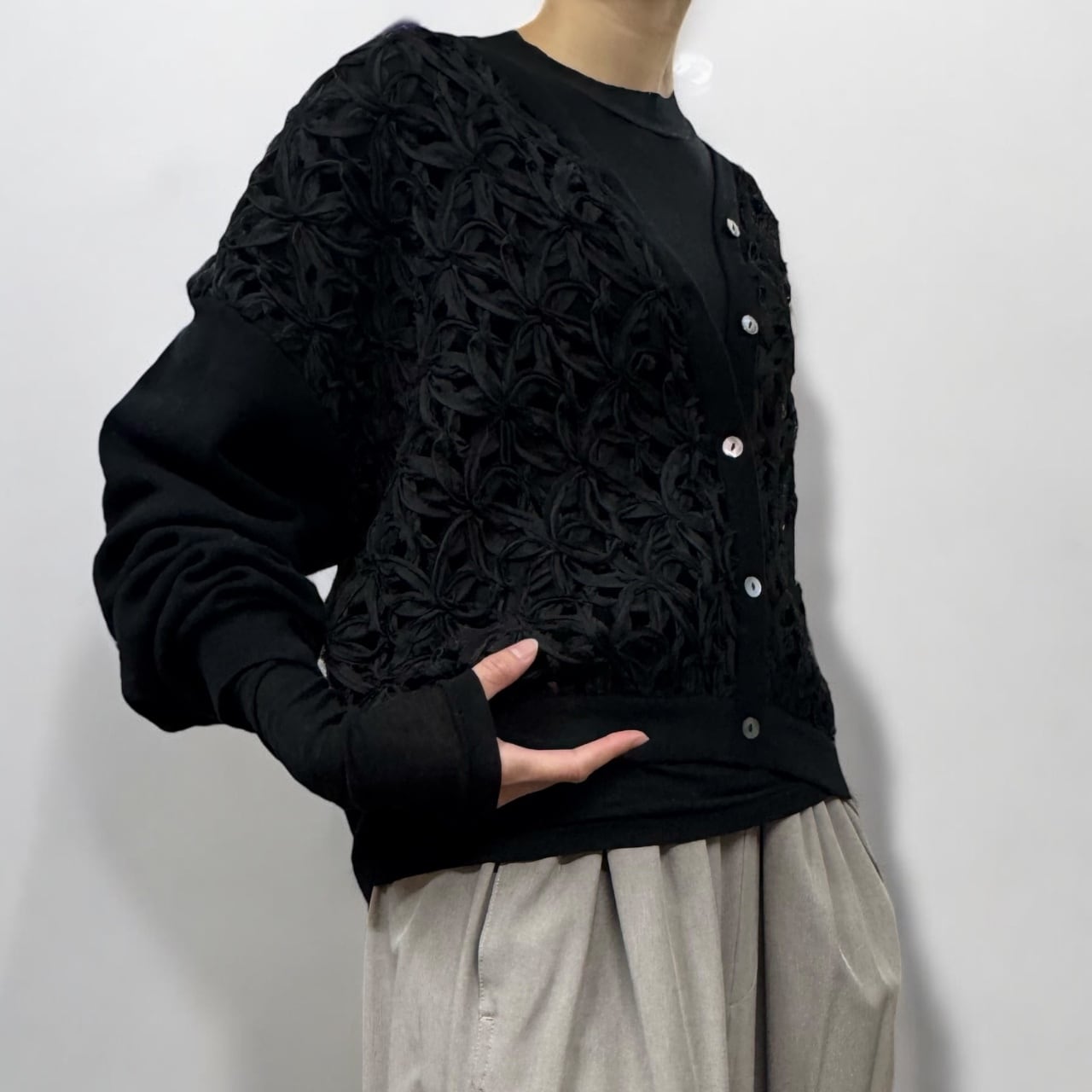 華やかさとシャープさを兼ね備えたフラワーシフォン×ニットカーディガン。繊細なフラワーモチーフのシフォンとハイゲージニットを使用しており、優しい印象を与えるのが魅力です。